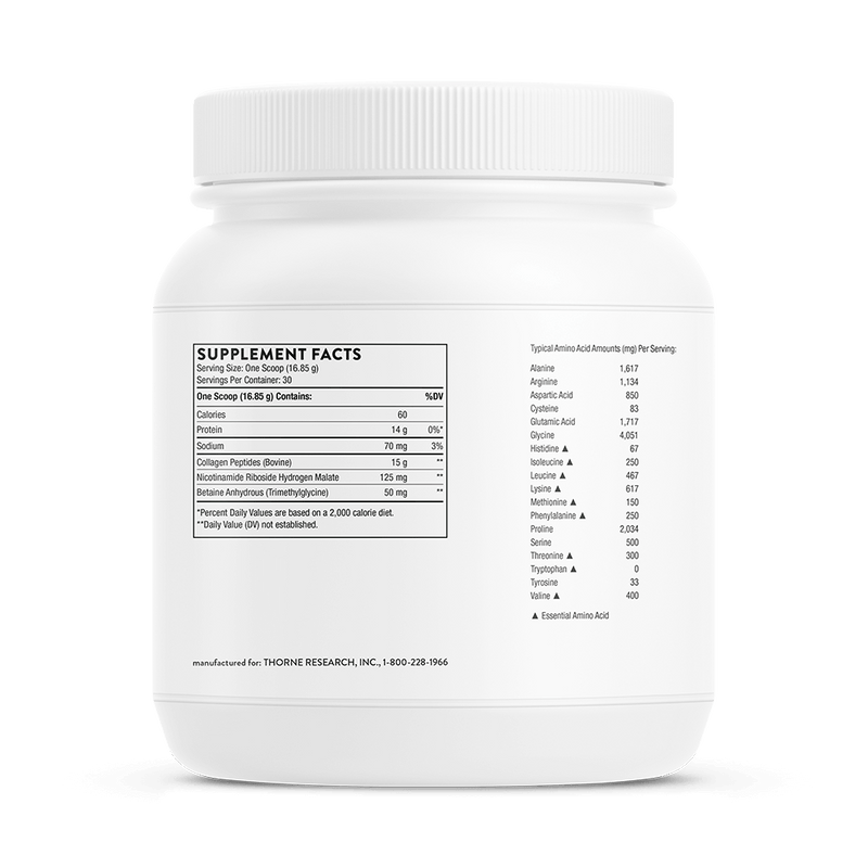 Thorne's Collagen Fit contains 15 grams of types I and III, grass-fed, hormone-free collagen per serving. Collagen is rich in the amino acids that function as the building blocks for the body’s bones, muscles, ligaments, tendons, skin, and other connective tissues.* Collagen peptides, also known as collagen hydrolysate, undergo a unique process that breaks collagen into shorter amino acid chains (peptides) that are easier to digest, as well as being free of the harsh chemicals used in other mainstream collagen products.