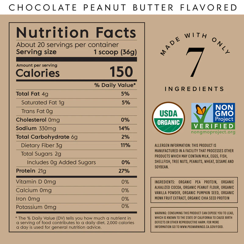 Ingredients: Organic Pea Protein, Organic Alkalized Cocoa, Organic Peanut Flour, Organic Vanilla Powder, Organic Pumpkin Seed, Organic Monk Fruit Extract, Organic Chia Seed Protein