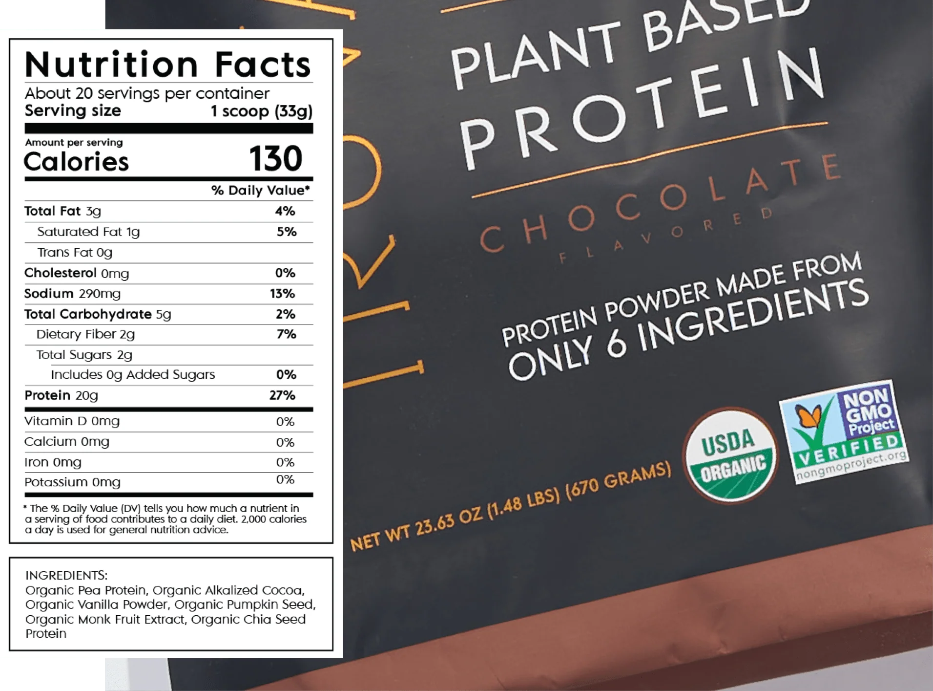 Ingredients: Organic Pea Protein, Organic Alkalized Cocoa, Organic Vanilla Powder, Organic Pumpkin Seed, Organic Monk Fruit Extract, Organic Chia Seed Protein.